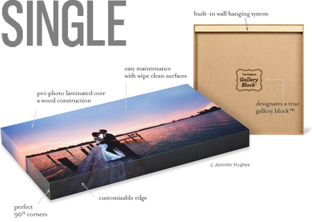 A "single" Gallery Block is a single professional print laminated over a solid wood constructed box. Each single Gallery Block is easy to maintain, no rx easy to hang, with no folded corners and perfect manufactured 90° angles.